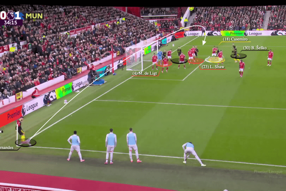 曼联对利物浦的制胜入球,也来自战术角球。B费传给禁区前的姆贝莫,但利物浦没有少打一人,故此费德里科·基耶萨加以封堵,他的射门被门将扑出。但B费再次传中,马奎尔头球破门完成了攻势。